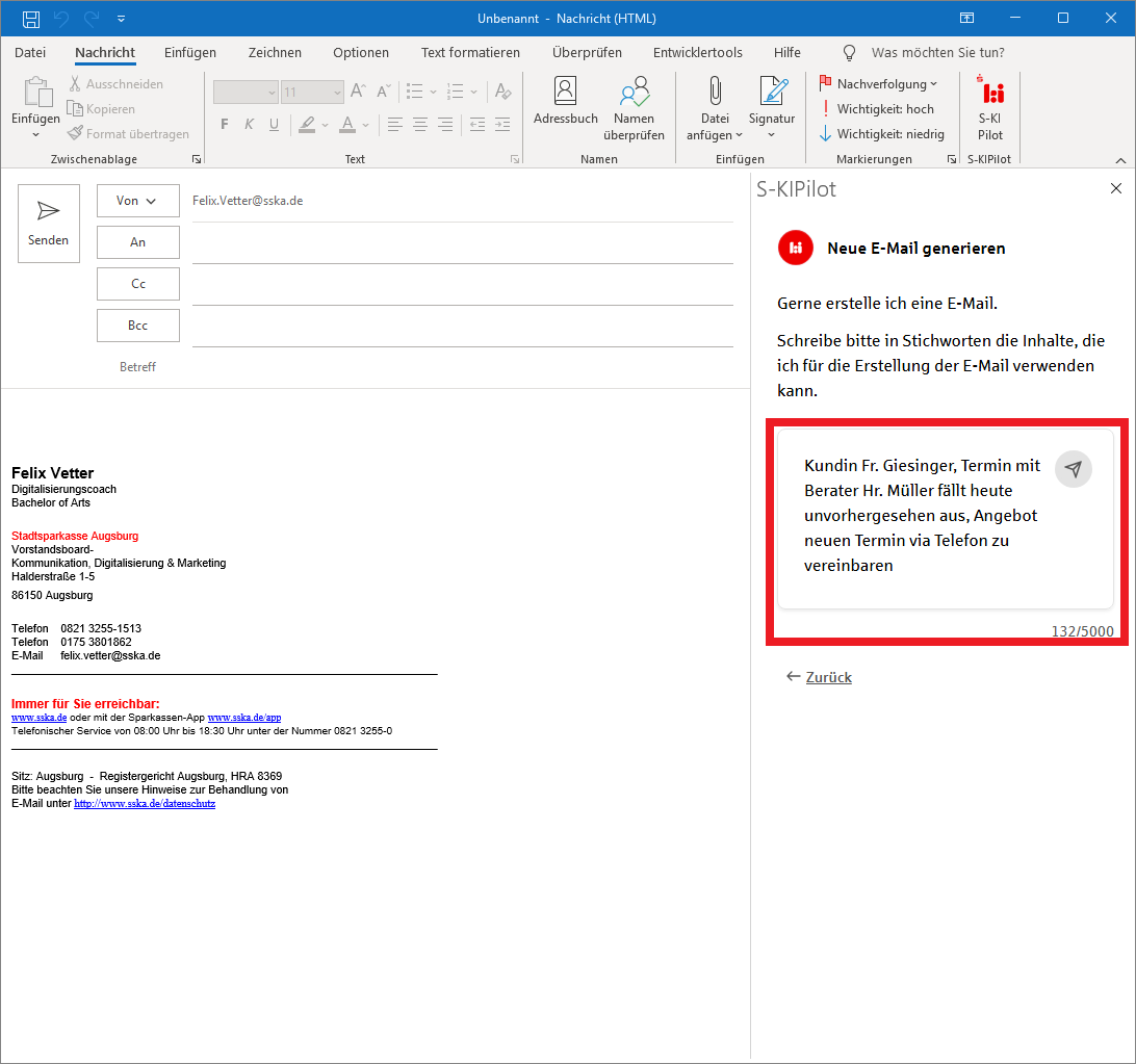 Großartig wie nahtlos wir jetzt den S-KIPilot immer in Outlook parat haben. Ich empfehle Ihnen auch, die anderen Funktionen auszuprobieren wie z.B. „Antwort erstellen“. Vorbei ist die Zeit sich den Kopf zu zermattern und mit einem leeren Blatt zu kämpfen. Stichpunkte eingeben und los geht es.